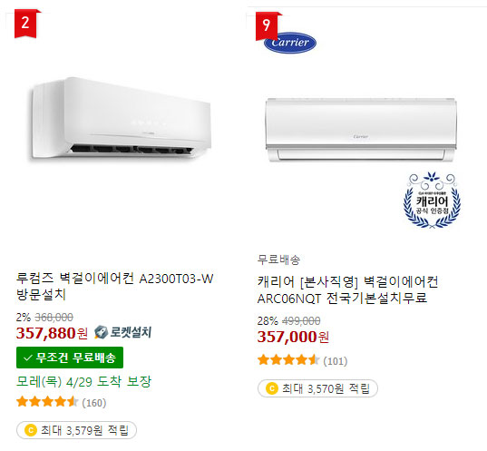 루컴즈 벽걸이 에어컨과 캐리어 벽걸이 에어컨인데요