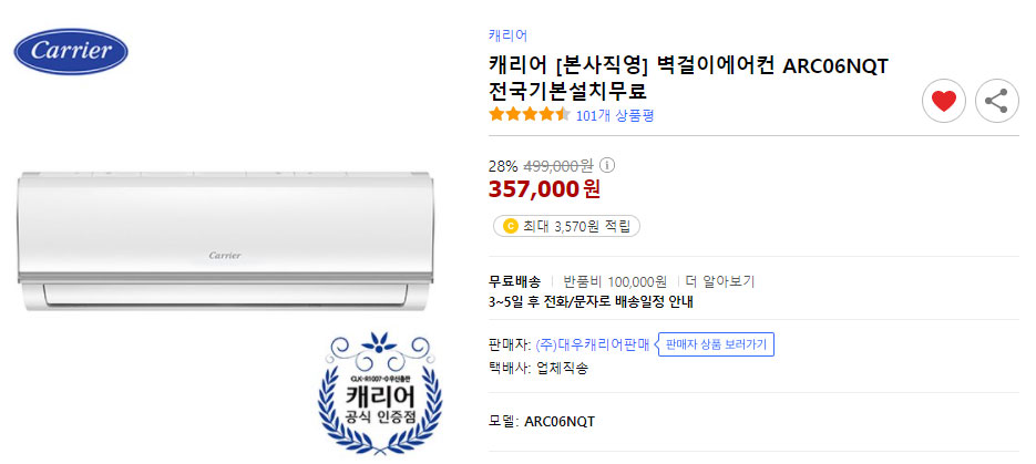 캐리어 벽걸이 에어컨을 선택하였습니다